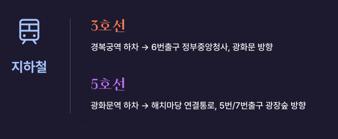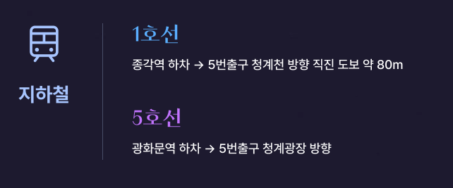 축제 기간 동안 많은 인파가 몰릴 것으로 예상되므로, 대중교통 이용을 권장합니다. 지하철 1호선과 5호선을 이용하면 청계천과 가까운 역에서 하차할 수 있습니다. 또한, 버스 노선도 다양하게 운영되니, 미리 노선과 시간을 확인해보시기 바랍니다. 주차 공간이 제한적이므로, 대중교통을 이용하는 것이 가장 편리합니다.