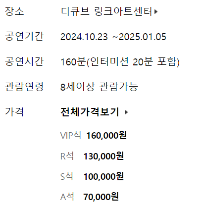 가격은 VIP 16만원, R석 13만원, S석 10만원, A석 7만원으로 구성되어있습니다.