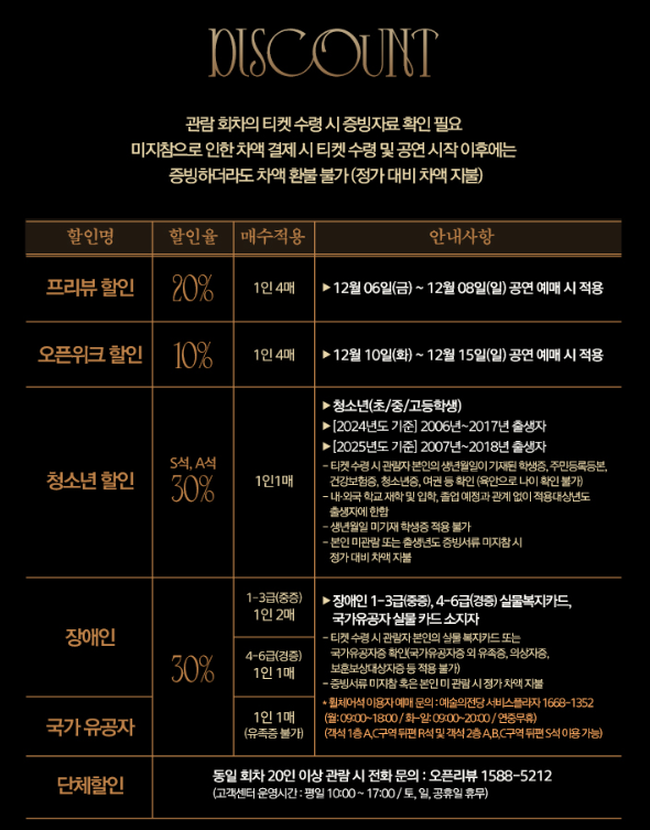 할인 정보는 예매처에 따라 다르지만, 프리뷰 예매 할인이나 단체 할인 등이 제공될 예정입니다. 또한, 학생증을 지참한 학생들에게는 추가 할인이 있을 수 있으니, 예매 시 꼭 확인해보세요. 그리고 공연 당일에는 현장 구매를 통해 할인 혜택을 받을 수 있는 경우도 있으니, 미리 알아두시면 좋습니다.