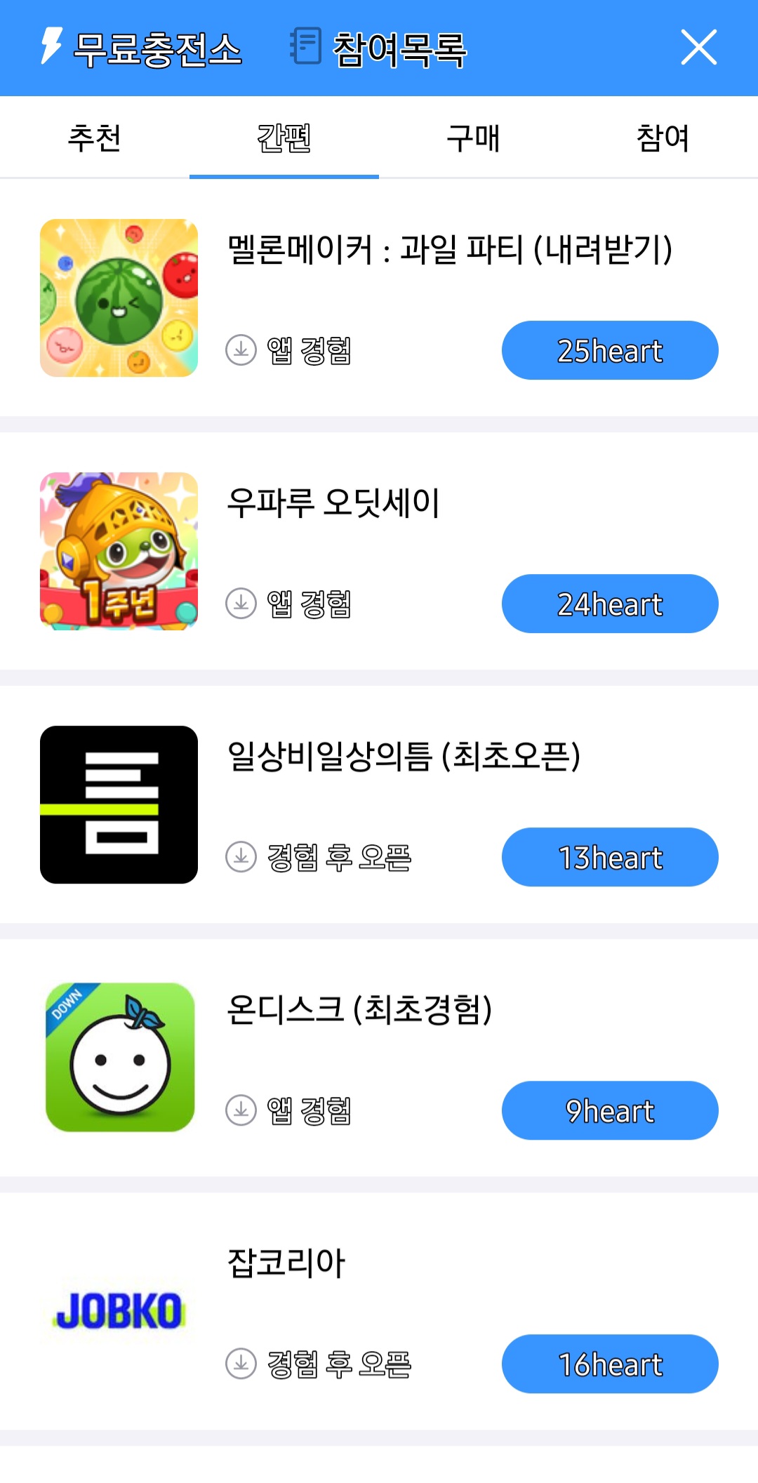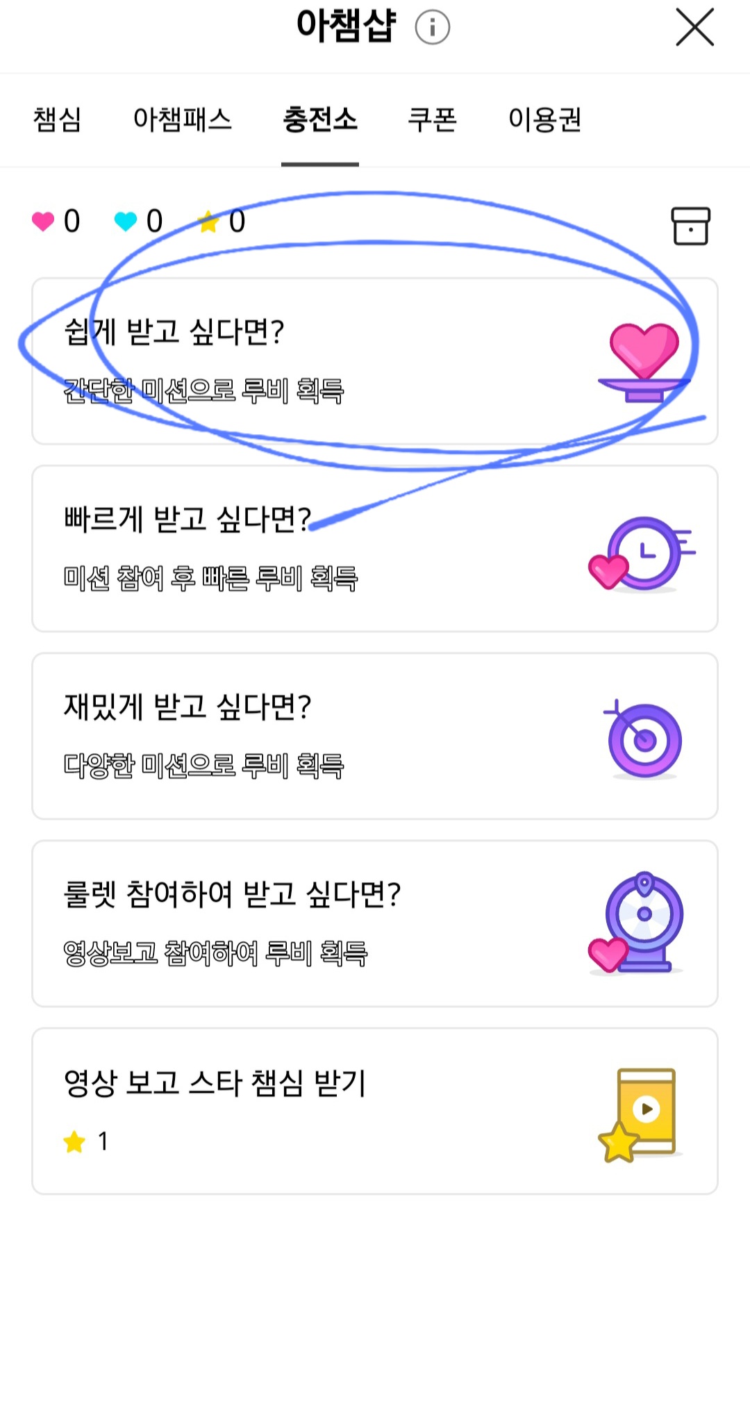 가장 위 '쉽게 받고 싶다면?' 이 부분을 클릭해 주세요. 그리고 애플리케이션을 다운로드하면 챔심이 충전됩니다.