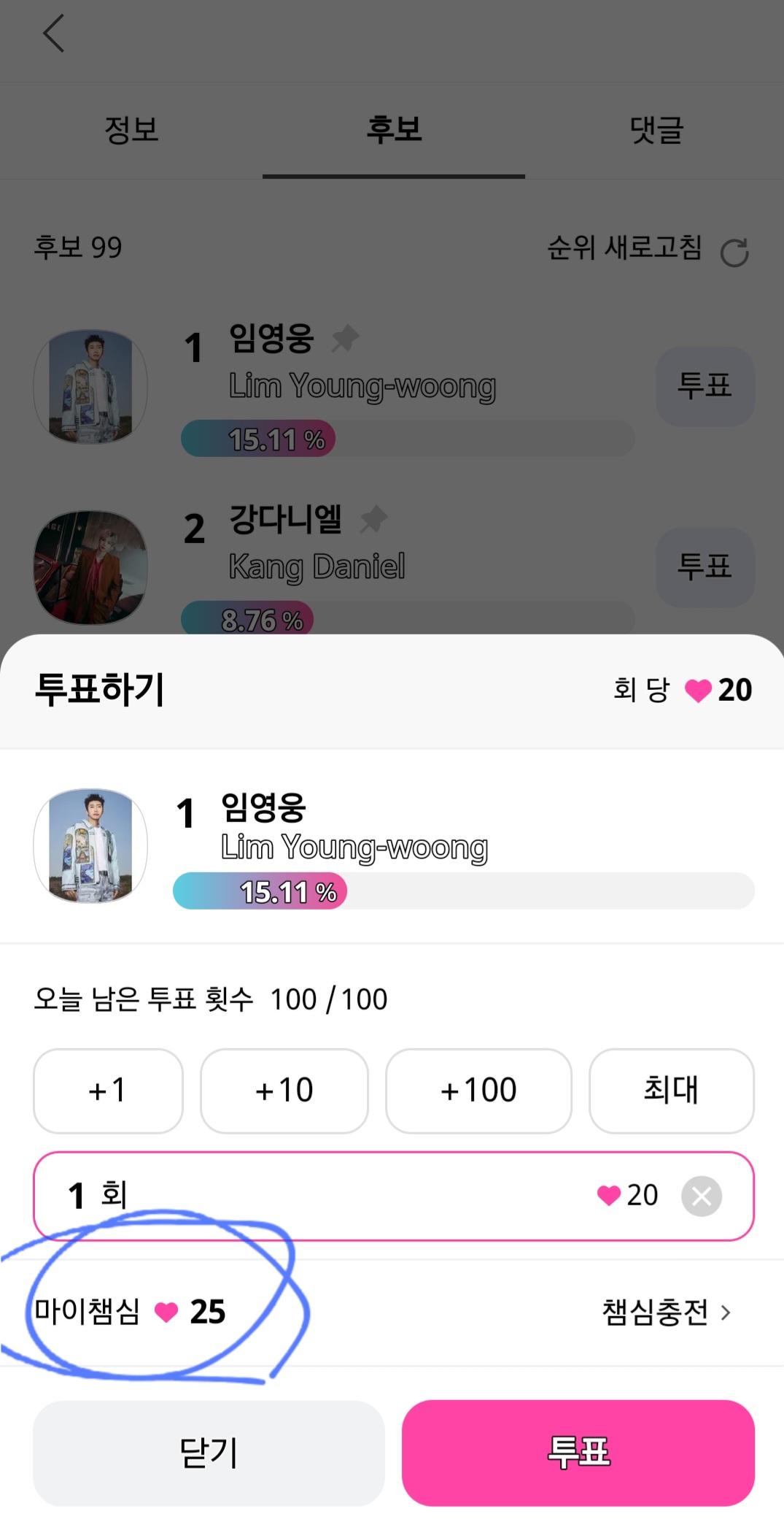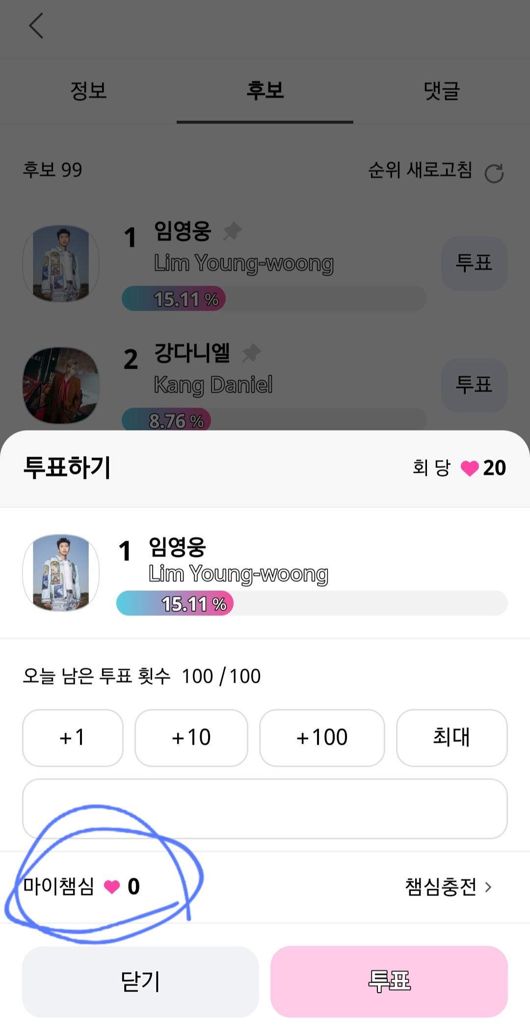 투표는 마이 챔심이 있어야 합니다. 처음 접속하시면 마이챔심이 0입니다.