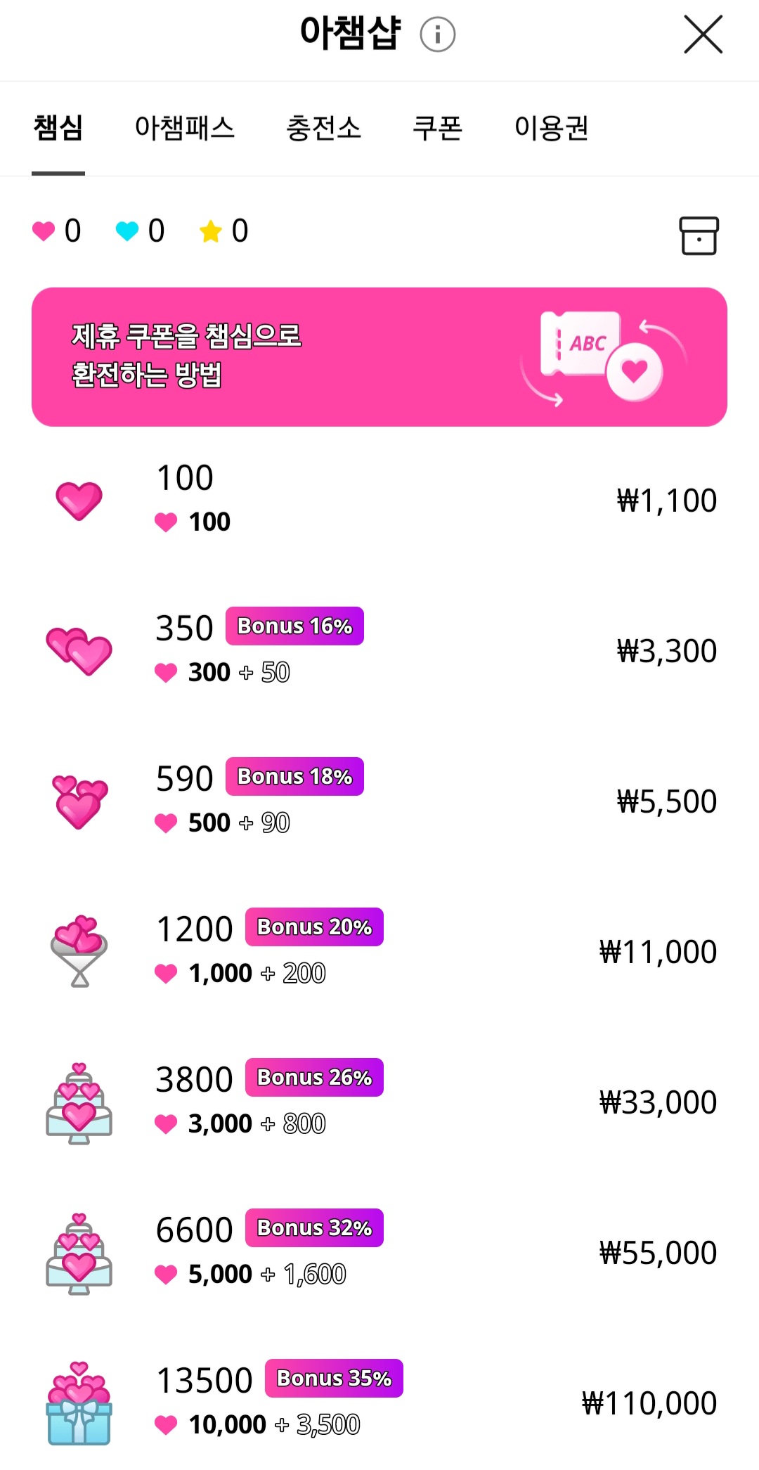 무료 방법 외에도 유료로 결제하여 충전할 수도 있습니다. '아챔패스'로 들어가시면 됩니다.