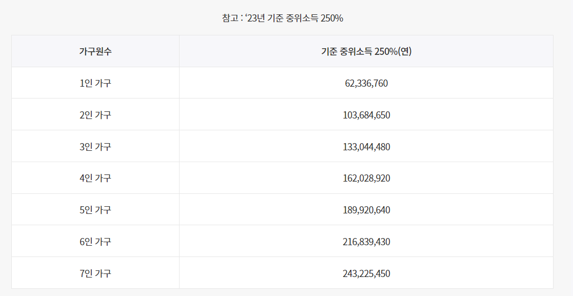 ✔ 가구소득 : 가구원 수에 따른 기준 중위소득 250% 이하에 해당하는 자