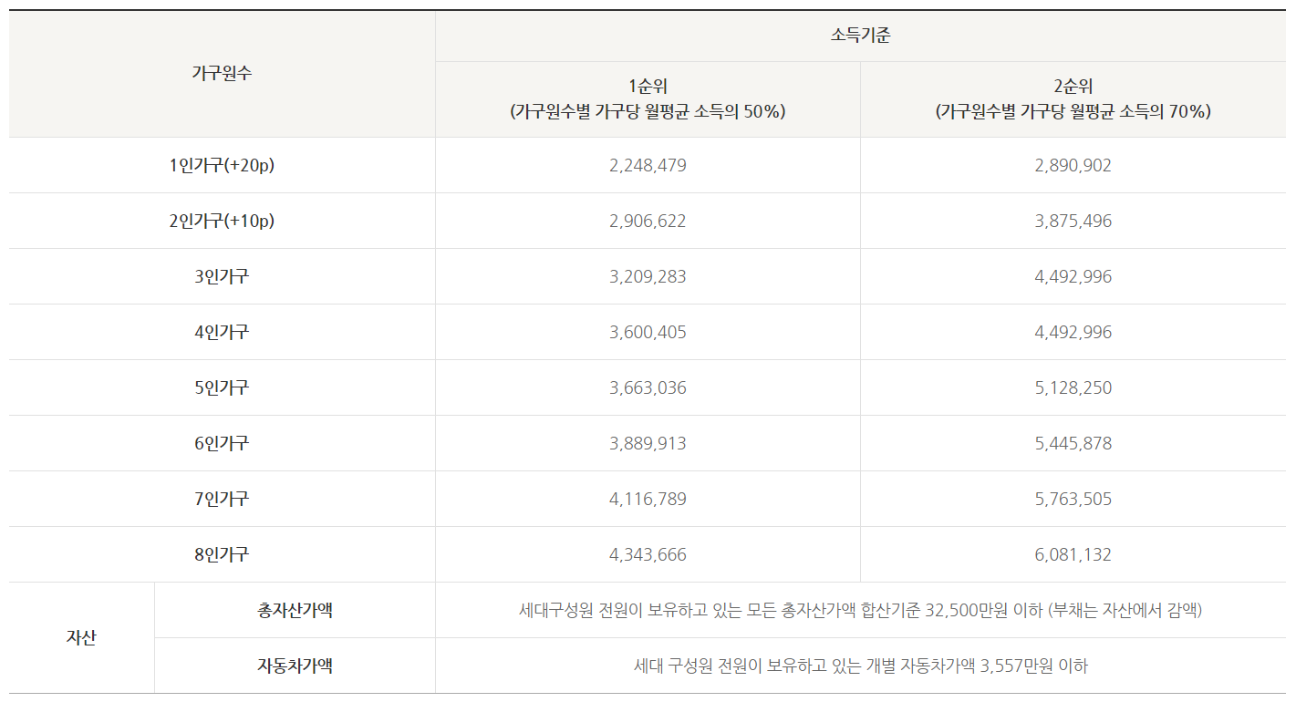 ✔1순위 (선순위) : 가구원수별 가구당 월 평균 소득 50% 이하 (1인의 경우 70% 이하, 2인의 경우 60% 이하)