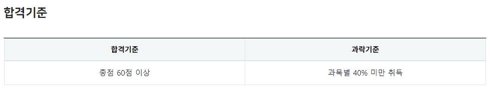 총 두 개 과목으로 1과목 20점(10문항), 2과목 80점(40문항)으로 나누어져있습니다. 합격 컷은 총점 60점 이상이며, 과목 별 정답율이 40% 미만이면 합격 기준인 총점 60점을 넘더라도 불합격입니다.